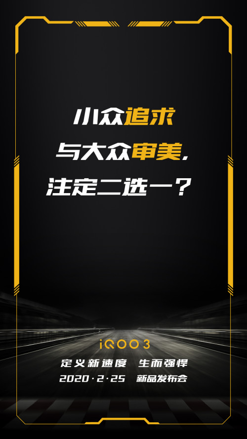 经过一段时间的预热,iQOO 3的主要配置相信大家已经有所了解。对于社交网络上的调侃言论“iQOO 3发布会就差价格了”来说,其实还有很多没有被曝光的黑科技等待我们去发现。今天,iQOO官博继续放出态度海报:“小众追求与大众审美注定二选一?”,结合放出的外观视频,之前备受好评的压感按键也得到保留,iQOO 3的真实面目已经浮出水面。