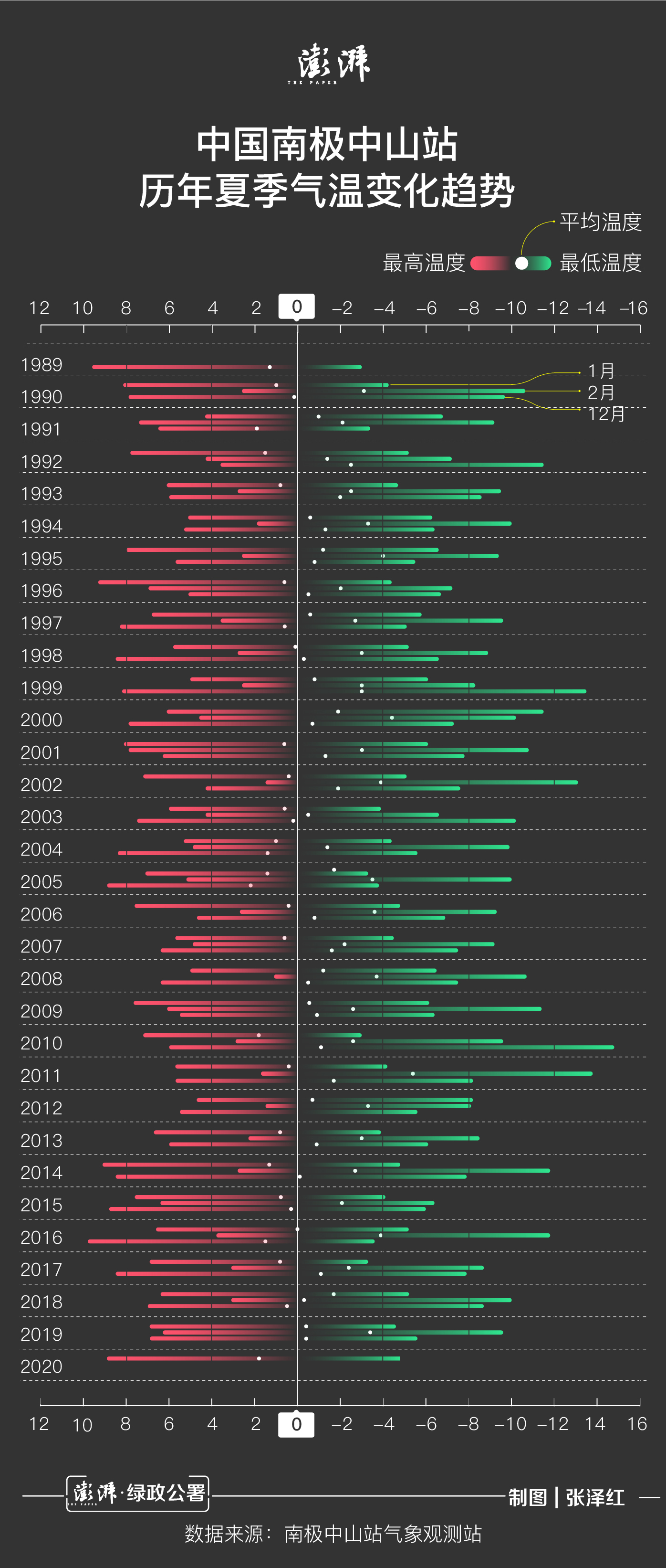 中山站气象观测数据从1990年开始记录,观测到最高气温是1996年的9.3℃;其中夏季平均温度最高的是2005年的1.4℃,最低是2000年的零下1.9℃。据朱孔驹提供的数据显示,2020年夏天的平均温度目前估算为1.0℃,观测最高温度为6.9℃。