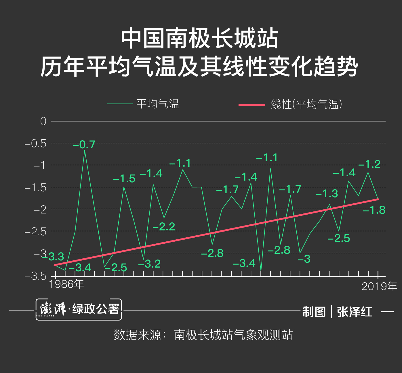 与“破纪录”西摩岛相距不远的我国南极第一站中国长城站的数据显示,从1984年建站以来,观测平均气温呈线性升高趋势,2月8日下午3点也测得近期高温8.7℃。公开数据显示,1989年观测出现的最高气温是11.7℃。