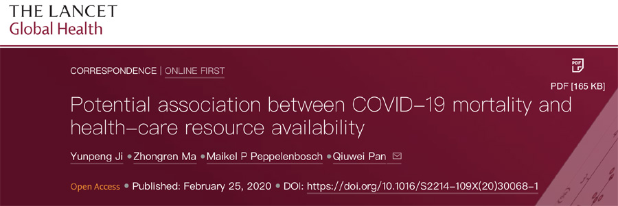 当地时间2月25日,西北民族大学生物工程与技术国家民委重点实验室、荷兰伊拉斯谟大学医学中心胃肠与肝病科的团队在著名医学期刊《柳叶刀-全球健康》(The Lancet Global Health)发表通讯文章“新冠肺炎死亡率与卫生保健资源可得性之间的潜在联系”。通讯作者为西北民族大学特聘教授、生物医学研究中心首席科学家潘秋卫。作者们研究认为,死亡率与当地的卫生保健负担相关,而认识到死亡率与卫生保健资源可得性之间的潜在联系,可能有助于中国其他地区、甚至全球其他国家更好地做好准备。