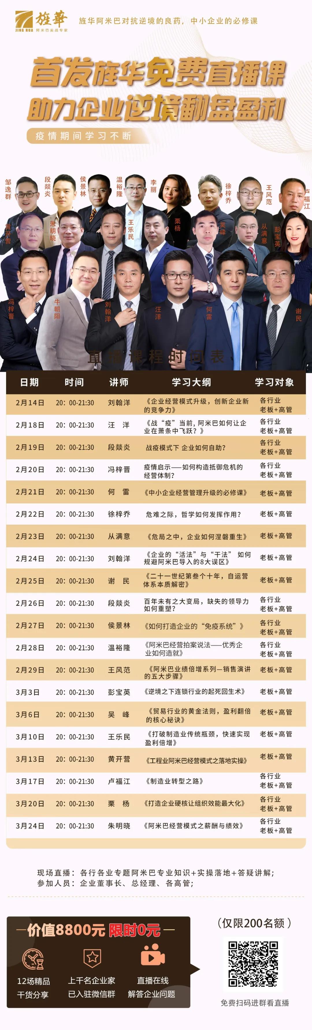 自2月14日起,旌华咨询开启公益免费直播课,直播内容主要为疫情下中小企业应对策略、经营出路 、获客模式、管理优化流程、激励绩效方式等等,以帮助企业优化经营模式平稳渡过困境。