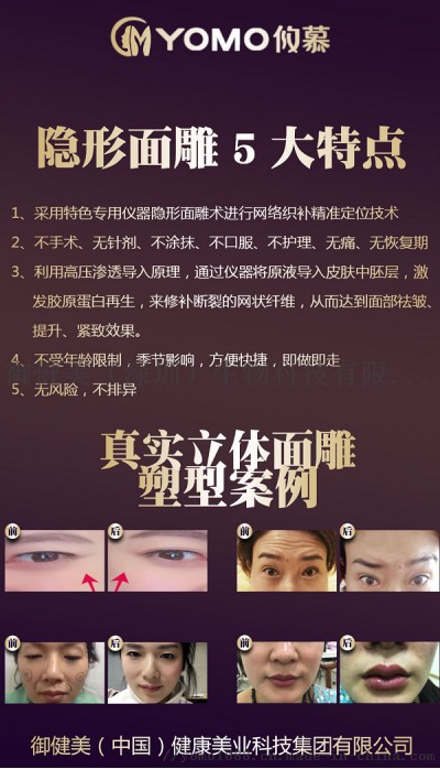 我们攸慕YOMO主推的项目是无针轻医美系列,从成分和技术上做突破,结合专用的操作仪器来使用,可以达到医美的效果,不开刀、不手术、不破皮、不出血、无微创,完全没有任何风险和副作用,从细胞开始修复,让皮肤恢复自然健康年轻态!