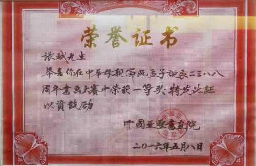 2016年5月8日,孟子诞辰2388周年,中国亚圣书画院举办纪念孟子2388周年书画大赛。吸引了来自全国各地的书画名家,非遗传承人张斌老师也受邀参加盛会。经过上千幅作品的展示和评比,张斌凭借《康熙一笔福书法》高超的技艺和契合儒家思想的选题,在本次书画大赛中获得一等奖,其作品广受全国书画同行好评。