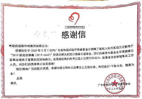 随后,美商婕斯又向广东省和慆祥医疗慈善基金会捐款200万元,用于2019新冠病毒科研及相关的医疗健康公益事业。