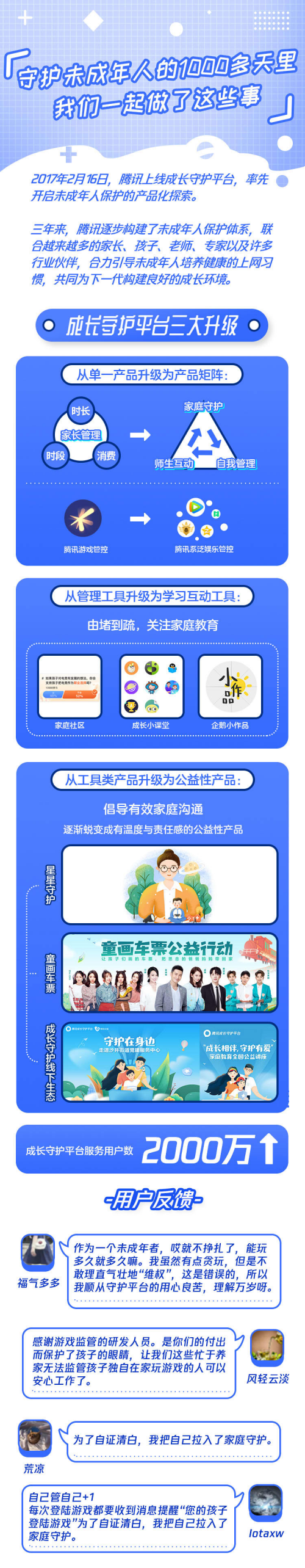 最新数据显示,腾讯成长守护平台的用户超过2000万,绑定成长守护平台的用户中,有82%游戏时长下降。