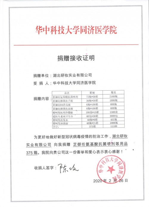 2月27日,上午又一批由湖北研妆实业有限公司捐赠的375箱抗疫物资抵达武汉同济医院,总价值60万余元。董事长陈出新亲自带队前往华中科技大学同济医学院。这是继之前捐赠芷御坊氨基酸抗菌喷剂和脾牛冲剂之后,研妆集团的再次爱心延续!