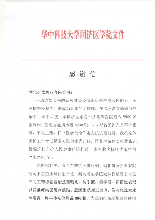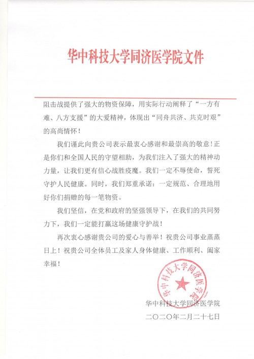 2月27日,该批物资已经顺利抵达同济医学院,交付与医院的医护团队,并将第一时间下发至抗疫一线人员,群心群力 , 为“最美逆行者” 护航!当日,华中科技大学同济医学院向该公司发来感谢信,并表达对所受捐物资规范合理的使用。对战胜此次疫情充满了自信。