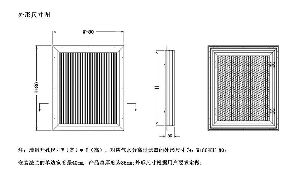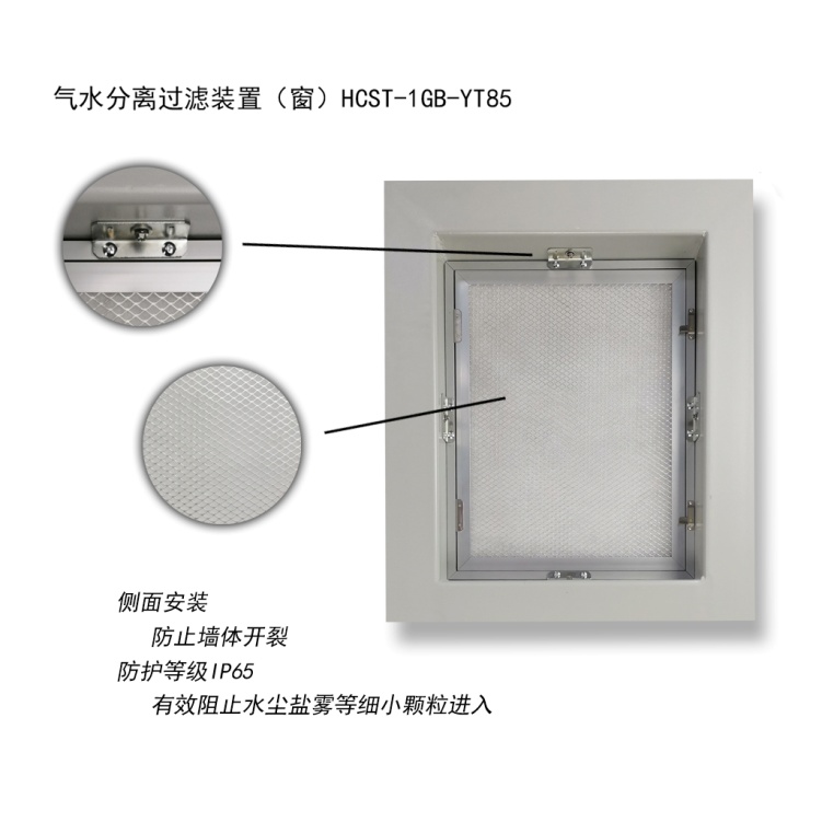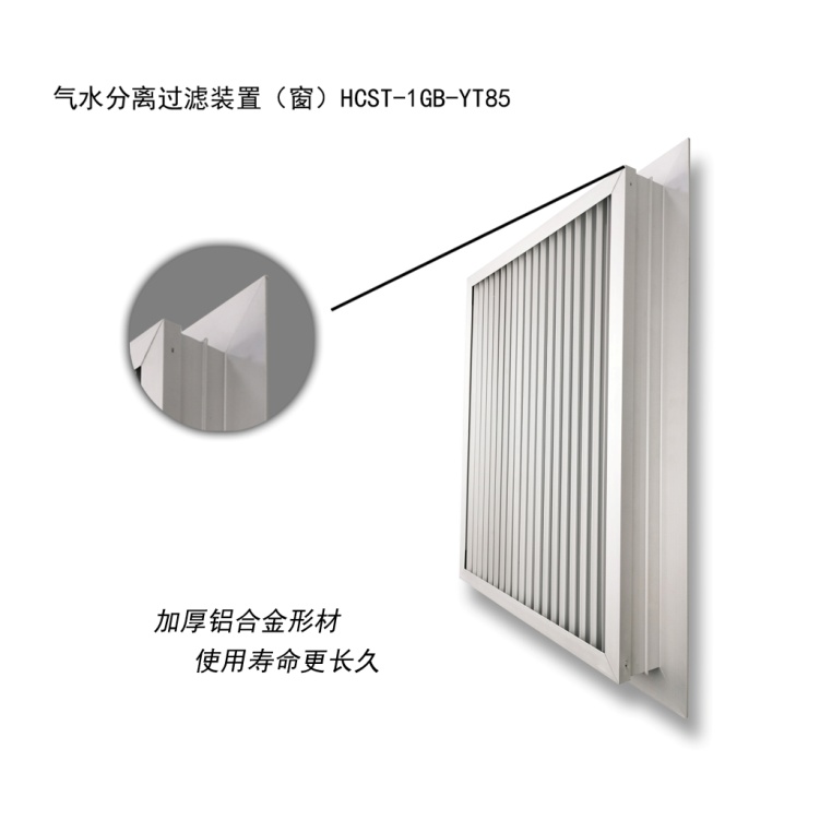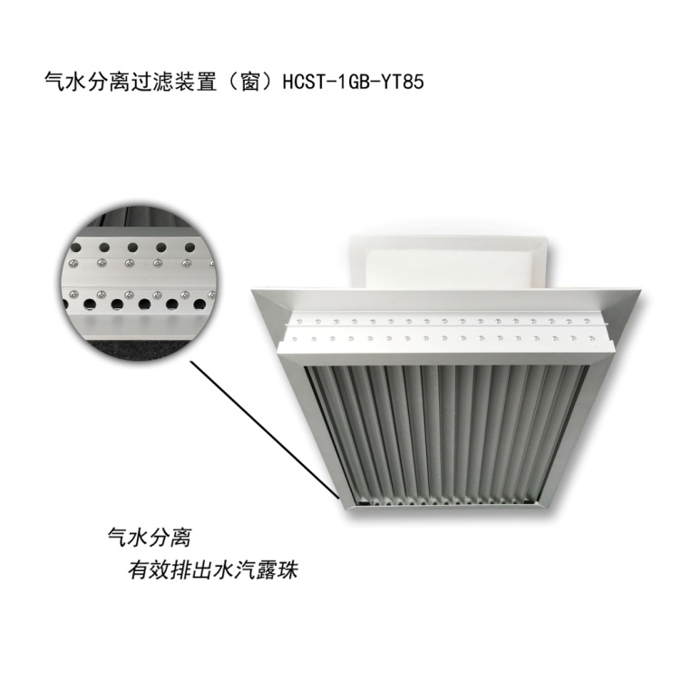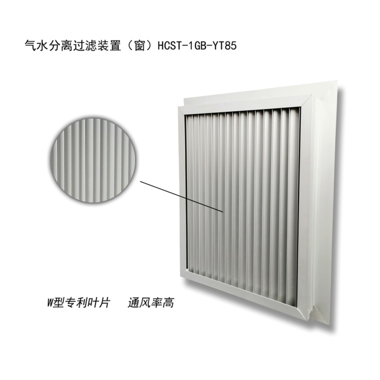 气水分离过滤器可以阻挡雨水、水雾、潮气、盐雾及沙尘进入室内,在经过翅片弯道过程中,空气中携带的水将被翅片分离,水在重力作用下自动下落到底部通过落水孔排出,同时空气中携带的水汽露珠及盐雾在翅片上累积后也将自动下落排出,后端的过滤器将多余的粉尘颗粒和盐雾颗粒过滤掉,满足实现防水、防潮、防沙、防盐雾之功能;