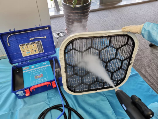 在进行正式的清洗工作之前,工作人员会先进行验机,为了减少污物感染,服务人员会与用户保持一定距离,同时减少不必要的交谈。验机结束后,服务人员会在设备周围进行遮挡,比如在空调周边及下方铺放一次性台布,有效隔离正式操作时产生的污染物。