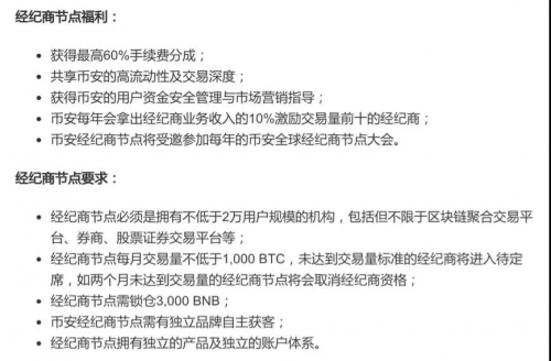 事实上,早在去年,币安就已经有了借B2B模式“开放”平台服务的苗头。去年9月,币安启动过“全球经纪商”计划,面向全球招募经纪商,首期招募100个节点。这些经纪商节点可以利用币安的API来使用订单撮合、账户管理、结算系统,共享币币交易的流动性和深度,且享有高比例手续费的分成。