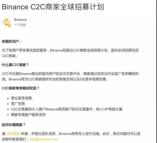 币安进入“开放式平台”时代后,开始越来越重视B端的力量,在交易业务板块也能发现B端的身影。1月21日,币安开始向全球招募“通过发布法币交易广告来赚取利润”的C2C商家。