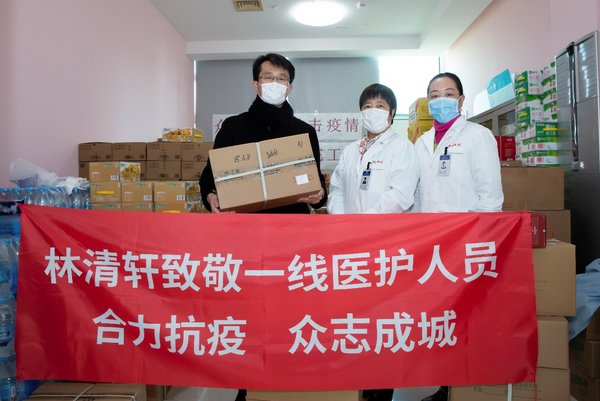 林清轩人事部副总经理李波,代表林清轩向复旦大学附属中山医院进行捐赠