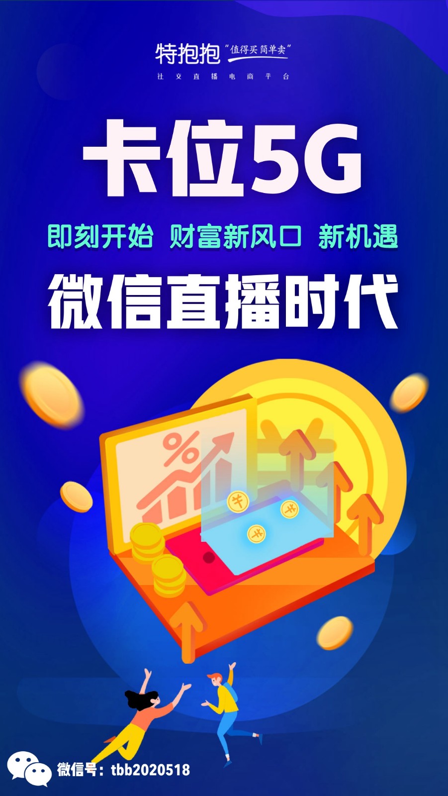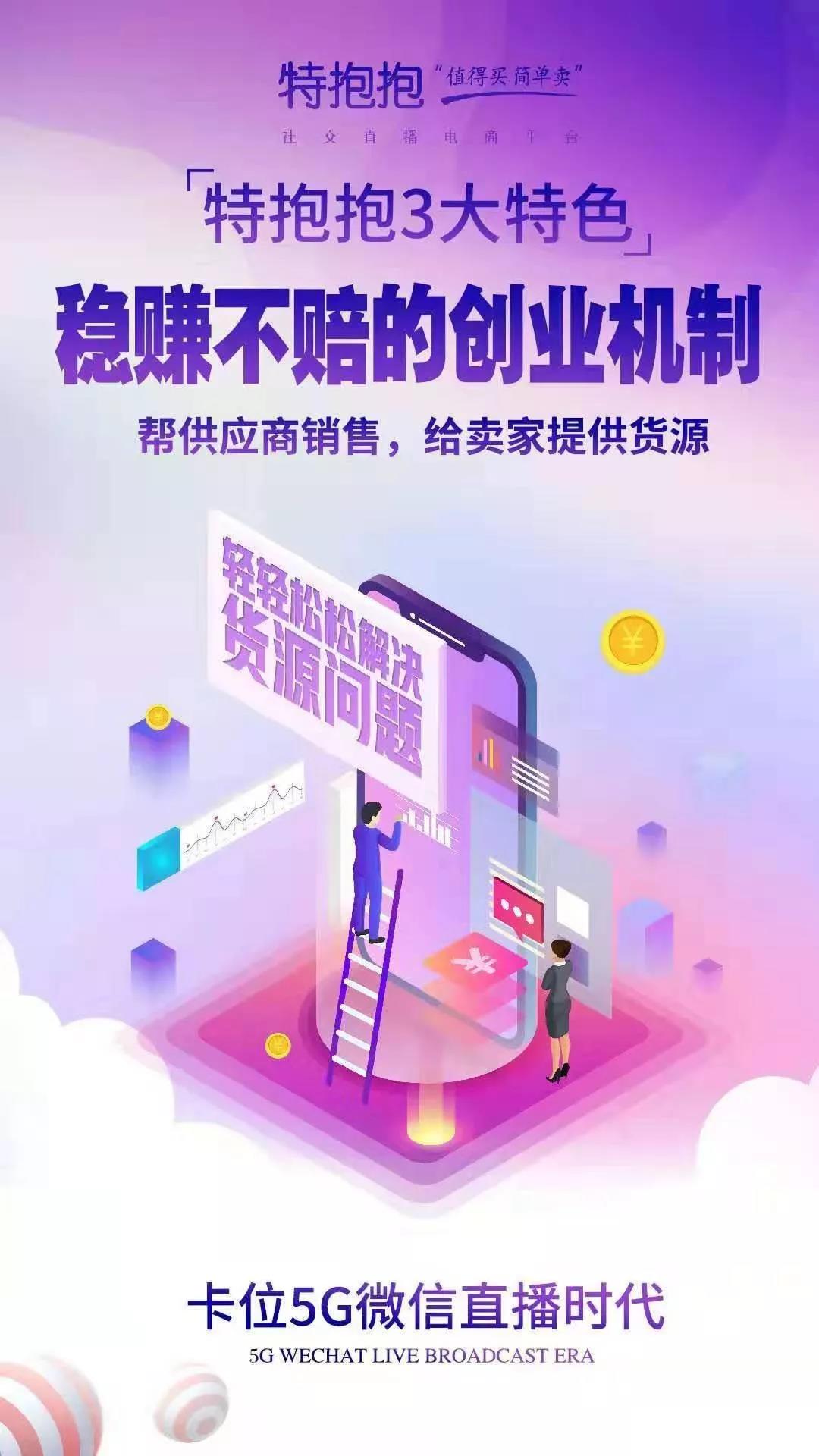特抱抱是⼀款以微信直播为核⼼的电商服务平台,看客不⽤下载APP,通过微信的关联⼀键进⼊到⾃⼰的直播间,实现⼀键下单,⼀键分享,⼀键转发,⼀键致富,打造素⼈主播,让每⼀个⼈都可以实现直播带货,招商,培训,引流,企业和品牌宣传。赋能千万中⼩型企业和商户解决卖货,营銷,宣传推⼴问题。
