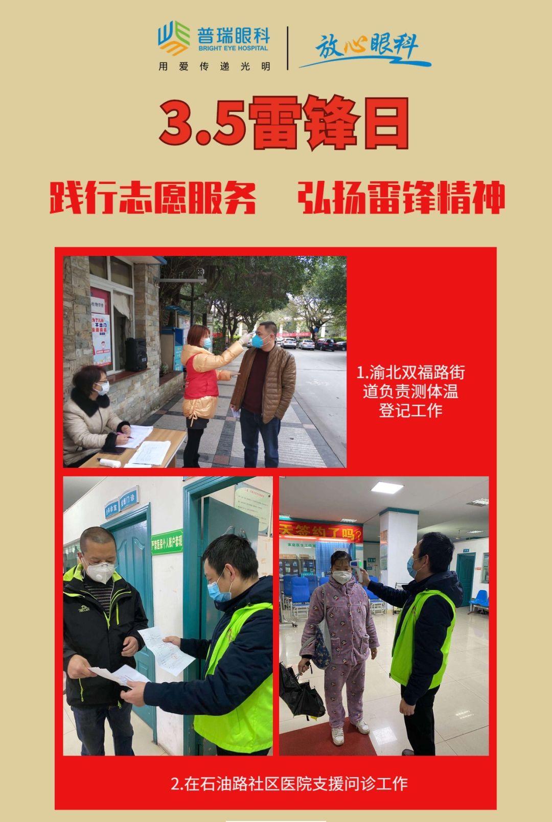 疫情还未结束,恰逢学习雷锋日,重庆普瑞眼科医院,积极践行志愿服务,弘扬雷锋精神。捐赠物资,支援一线,严抓院内外感控工作,同步开展线上问诊和公益直播课堂,普瑞人用行动践行用爱传递光明的集团理念。中国加油,武汉加油,重庆加油,我们共克时艰!