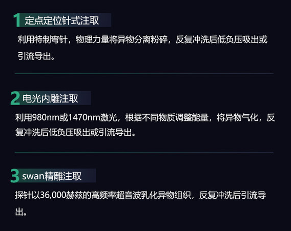 对于不专业注取的机构或者不熟悉这种技术的人,在他们眼里,针式取出只是简单的抽吸,并不能将注射物取干净。这种认知是错误的,针式取出不是简单的抽吸,是利用针口注取的统称,注取的方法并不单一。是根据异物的属性、体内的变化以及位置的不同。是相对传统切开而言,更加适合大众的一种注取方式。对于注射物取出者来说伤害达到忽略不计,同时注射物取出率较高。目前成熟的技术有SWAN精雕注取、定位定点针式取出,电光内雕注取。每一种方式都能很好将注射物取出的同时将其抑制。
