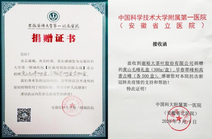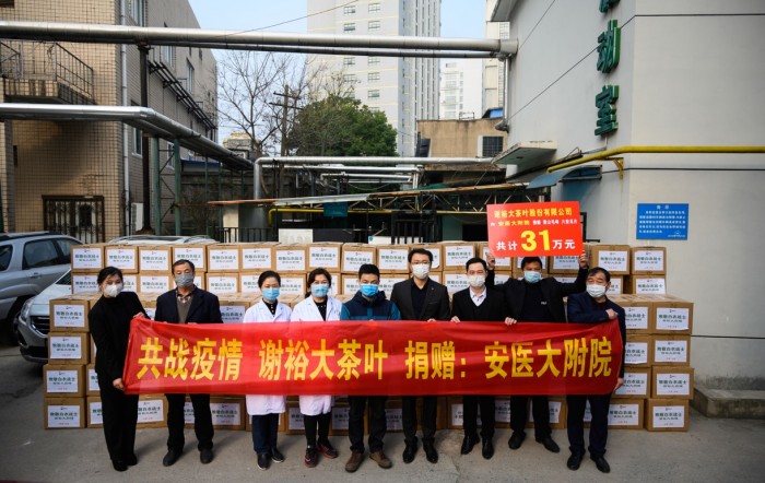 据悉,本次受捐的两家医院不但是安徽省收治新冠肺炎的主要定点医院,同时分别派出了数批医疗队奔赴湖北,截止发稿时,大量医务工作者仍然奋战在救治一线。作为有责任有担当的茶业企业,虽不能到抗击疫情的一线,但是谢裕大一直在后方给予大力支援,以公益行动助力抗“疫”。防疫抗疫工作到了最为关键的时刻,希望这一杯杯来自谢裕大的茶水能为长期奋战在疫线的医务工作者送上一份温暖健康的心意,在紧张的工作间隙通过喝上一口热茶,能够提神消疲,暖胃驱寒,提高免疫力,保持健康的体魄坚守在战疫一线,早日打赢这场没有硝烟的战争。