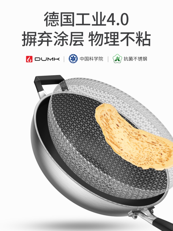 这样的抗菌炒锅无疑为原本略显平淡的不锈钢锅市场注上了一记活力针。在这之前,Dumik(德玛克)为坚持健康理念,第一个将医用级316不锈钢运用于不锈钢厨具,现在也是作为首个和中科院金属研究院合作的厨具品牌商家,研发出新型抗菌不锈钢炒锅,无疑可以看出dumik一直在遵循着他们的使命(用健康厨具赋能健康生活),那么前面提抗菌锅的另一个特性不粘,也采用的是来源于德国的纯物理技术。