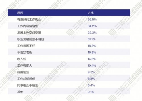 图表【教练平均跳槽周期】教练的频繁跳槽与流动、流失,从侧面上也说明了健身行业场馆与教练之间的供求关系不平衡,但在这里小螺想说一句,【不会游泳,换多少个游泳池,都没有用】。跳槽可能解决不了你技术性的问题。如果你能坚持2-3年以上在一家良性公司发展,那积累的资源以及经验将是你重复跳槽基层工作的3倍好处。这里也反应了教练普遍缺乏了职业规划。因为我们都知道,在一家公司发展3年是比3年跳3家公司来的更好一些的。 3、教练跳槽的原因 虽然教练普遍缺乏职业规划但他们都非常重视未来的发展前景,因为有55.3%的教练是因为看好行业未来的发展而进入行业的。教练从一个机构离职的原因,66.5%的人因为有更好的工作机会。