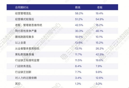 图表【教练离职的十一个原因】而其它因素如工作强度大、收入低、同事相处不融洽、成就感低这些因素排名相对靠后,可见教练更在意的是自己的职业发展和突破。除此之外,教练与老板的认知存在差异,这也是影响跳槽离职的矛盾点。在老板的认知视角,“经营模式较落后”、“同行恶性竞争严重”、“黑私教现象普遍”包揽了问题排行榜前三。在教练眼中,“经营模式较落后”“经营管理混乱”和“老板管理者思维传统”。这个认知的差异也是教练跳槽或者离职的潜在原因。