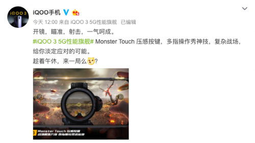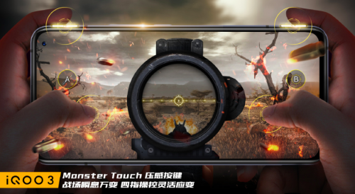 最值得一提的是,iQOO 3上延续了广受好评的Monster Touch压感按键:通过手机侧边框上的两个压感按键,与屏幕上自定义的位置实现映射,帮助用户在游戏中实现快捷的多指操作。用户可以在吃鸡游戏中,实现边移动边开枪;在王者荣耀中,实现快速换装备等按键操作体验。在加强按键质量更稳定更可靠的同时,增加用户在游戏过程中的趣味性。