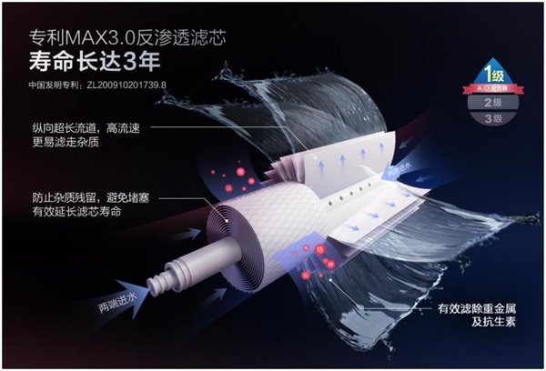 该系列产品搭载了A.O.史密斯独有的专利MAX3.0反渗透滤芯(中国发明专利:ZL200910201739.8),能有效滤除水中的病毒、消毒副产物、重金属及抗生素等有害物质,寿命长达3年。经权威机构测试认证:A.O.史密斯反渗透净水机对约26纳米的噬菌体病毒滤除率高达99.999%。
