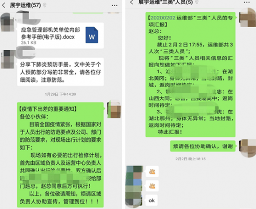 除了以上措施之外,展宇运维还积极利用各类办公软件,建立疫情信息微信群,开展疫情防治知识宣传,加强联防联控工作。运营中心向各电站推送疫情防护、防控知识,做到疫情信息无缝隙、全面覆盖、全员覆盖,确保电站运维团队的稳定。
