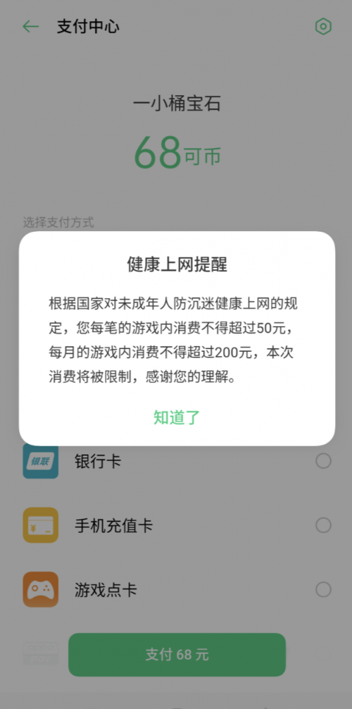 在防沉迷系统上线后,使用OPPO手机的用户在游戏付费时都必须完成强制实名认证。在完成认证后,终端将禁止8岁以下未成年人充值;限制8岁以上未满16岁用户单次充值不超过50元,每月累计充值金额不超过200元;限制16岁以上未满18岁用户,单次充值不超过100元,每月累计充值金额不超过400元。而未完成实名注册的用户将被禁止在游戏中充值。