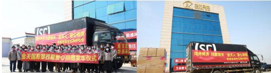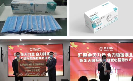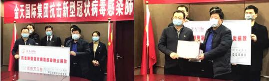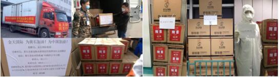 2月,金天国际连续开展了三期爱心捐赠行动,捐献了总价值超百万元的口罩、现金及中医生态养护物资。面对华中科技大学同济医学院附属协和医院请求社会支援医疗物资,金天国际不计成本从国外高价采购一万只符合国家医用标准的N95口罩,于2月5日直接送达武汉协和医院;在全国抗“疫”关键阶段,2月12日,金天国际委托宿迁慈善总会定向为宿迁市疫情防控捐赠20万元现金,助力疫情防控工作;2月24日,金天国际针对一线女性医护健康养护用品稀缺易导致免疫力降低,增加病毒感染风险,快速筹措176箱价值百万的雪莲生态保养贴、陌尚生态卫生巾等生态养护产品发送至武汉23个院区、卫生服务中心及黄石市政府,温暖一线女性医务人员。