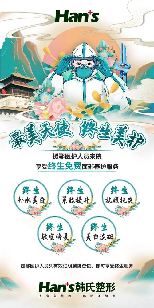为了让援鄂医护人员脱下口罩后恢复美丽容颜,济南韩氏整形外科医院开展一系列援鄂医护人员面部养护公益活动。援鄂医护人员来院,享受终生免费面部养护服务,终生项目为以下五项: