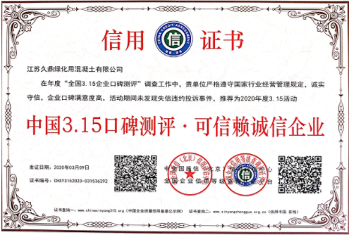 诚信是中华民族的传统美德。对于个人而言,诚信是立身处世的基本准则。对于企业而言,诚信是企业立足之本,更是企业发展之道。在3.15国际消费者权益日来临之际,从中企国质信信用评估中心传来喜讯。江苏久鼎绿化用混凝土有限公司在全国开展的2020年度“全国3.15企业口碑测评”调查工作中,荣获“中国3.15口碑测评·可信赖诚信企业”荣誉称号;这是对江苏久鼎绿化用混凝土有限公司多年来坚持诚信经营的肯定。也是向业内和市场发出诚信的最强音。