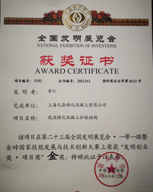 水利工程中的的堤防、河道护坡是一项需要兼顾防洪、安全、生态修复和资源利用的工程护坡技术,而现浇绿化混凝土技术既能够达到河道安全的目的,又能够实现河流生态的恢复及资源利用;很大程度上解决了人们对水利护坡生态化的迫切需求。上海久鼎绿化混凝土有限公司是目前国内唯一一家专业生产现浇绿化用混凝土的公司。江苏久鼎绿化用混凝土有限公司是在上海久鼎绿化混凝土有限公司现有的技术基础上成立的一家公司,并在各地承接了不少项目。“现浇绿化混凝土护坡”技术是上海久鼎绿化混凝土有限公司董事长李仁从2003年开始,对现浇绿化用混凝土的结构原理等多方面进行不断深入的摸索和研究,解决了现浇绿化用混凝土的抗压强度、孔隙率、抗水土流失、除碱、沉浆等一系列对工程绿化效果及工程牢固性、稳定性等各方面带来影响的技术难题,该产品针对不同地区、不同环境、不同土壤土质条件下的护坡工程进行科学合理的运用,真正实现了人们所向往的混凝土上长植物的愿望。