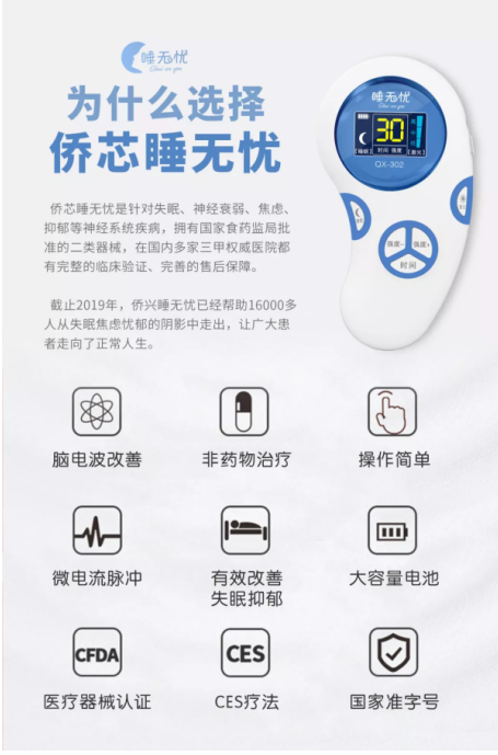 现在,ces治疗作为一项全球性的治疗手段已经超过27年历史,全球的用户已经超过了30万用户,在中国,安泽思侨芯睡无忧作为独一无二的ces治疗设备已成为精神科医生的常备治疗仪器,在国内许多三甲医院的精神科室都有放置,不少患者在医院使用效果非常好后选择了自行购买,在家里进行治疗。