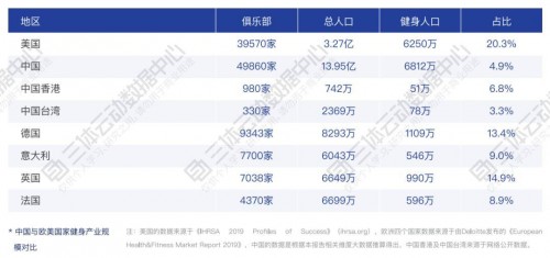 根据IHRSA 2019的数据报告显示,美国截止2019年健身俱乐部数量是39570家,健身持卡会员数6250万,健身人口渗透率为20.3%。美国的俱乐部数量和持卡会员数量与IHRSA 2018年的数据相比有一定的下滑,可能存在数据统计的差异性,请谨慎参考。