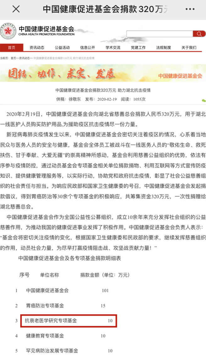 爱心捐款暖人心,齐心协力抗疫情!近日,在湖北疫情发展迅速,各类抗疫物资紧缺情况之下,武汉跃莱健康产业有限公司联合中国健康促进基金会,以抗衰老医学研究专项基金的名义,向湖北省慈善总会捐款人民币10万元,用于湖北一线医护人员购买防护用品,为援助疫区抗击疫情尽一份力量。