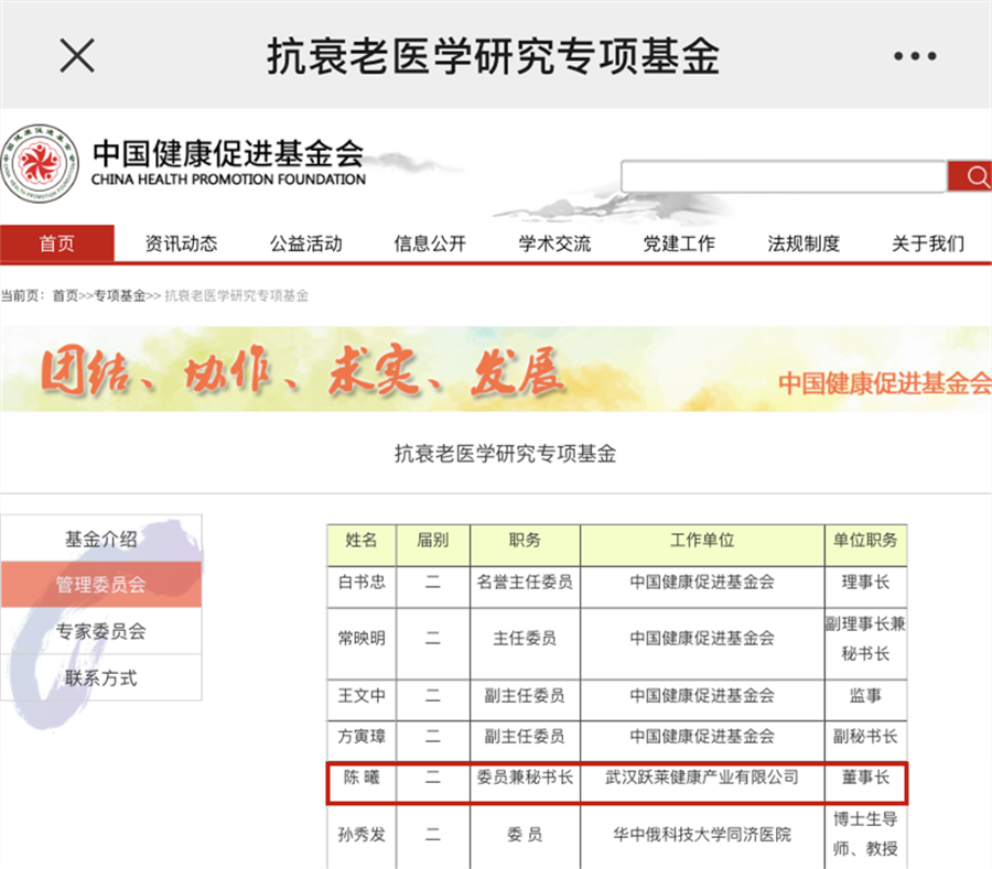 跃莱公司作为中国健康促进基金会抗衰老医学研究专项基金管理委员会主要发起单位,多年来积极履行自身责任与义务,向全社会传播正确的抗衰老理念及方法,为我国抗衰老医学研究工作及健康产业的发展做出了重要贡献。