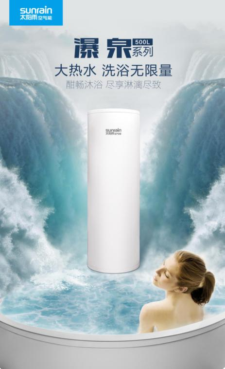 以太阳雨空气能瀑泉系列为例,产品最大容量可达500L,对比普通空气能热水器而言,产品具备超大容量、海量热水、多点供应等优点。为了保证设备在大容积热水供应的前提下能够实现快速制热,太阳雨瀑泉系列空气能热水器采用蓝盾墙三大核心技术,搭载的D-MAX制热技术,采用双通道结构设计,利用增大换热面积的方式,提高换热效率。