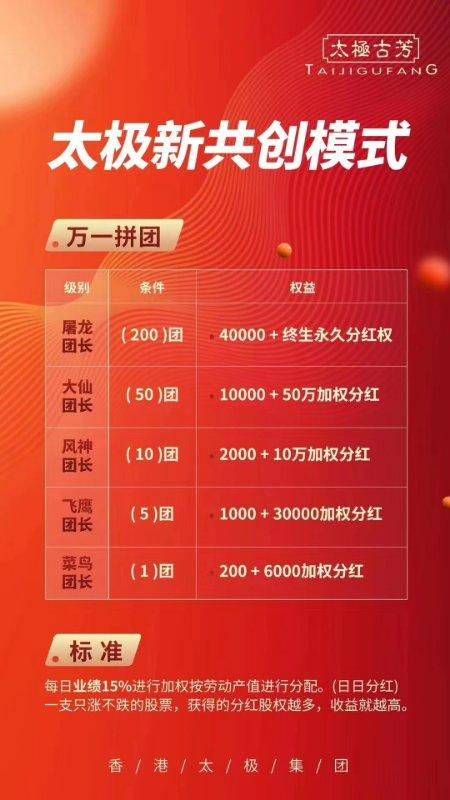 看完是不是觉得特别容易呢,传统微商货没有卖完,钱就打水漂了,而我们万一拼团,不管你是开1个团还是200个团都有对应的奖励和分红,货没有卖出去,也不影响每天拿分红赚钱,可以说是轻松躺赚了!太极古芳官方咨询微信:CK809485786电话:13884337122
