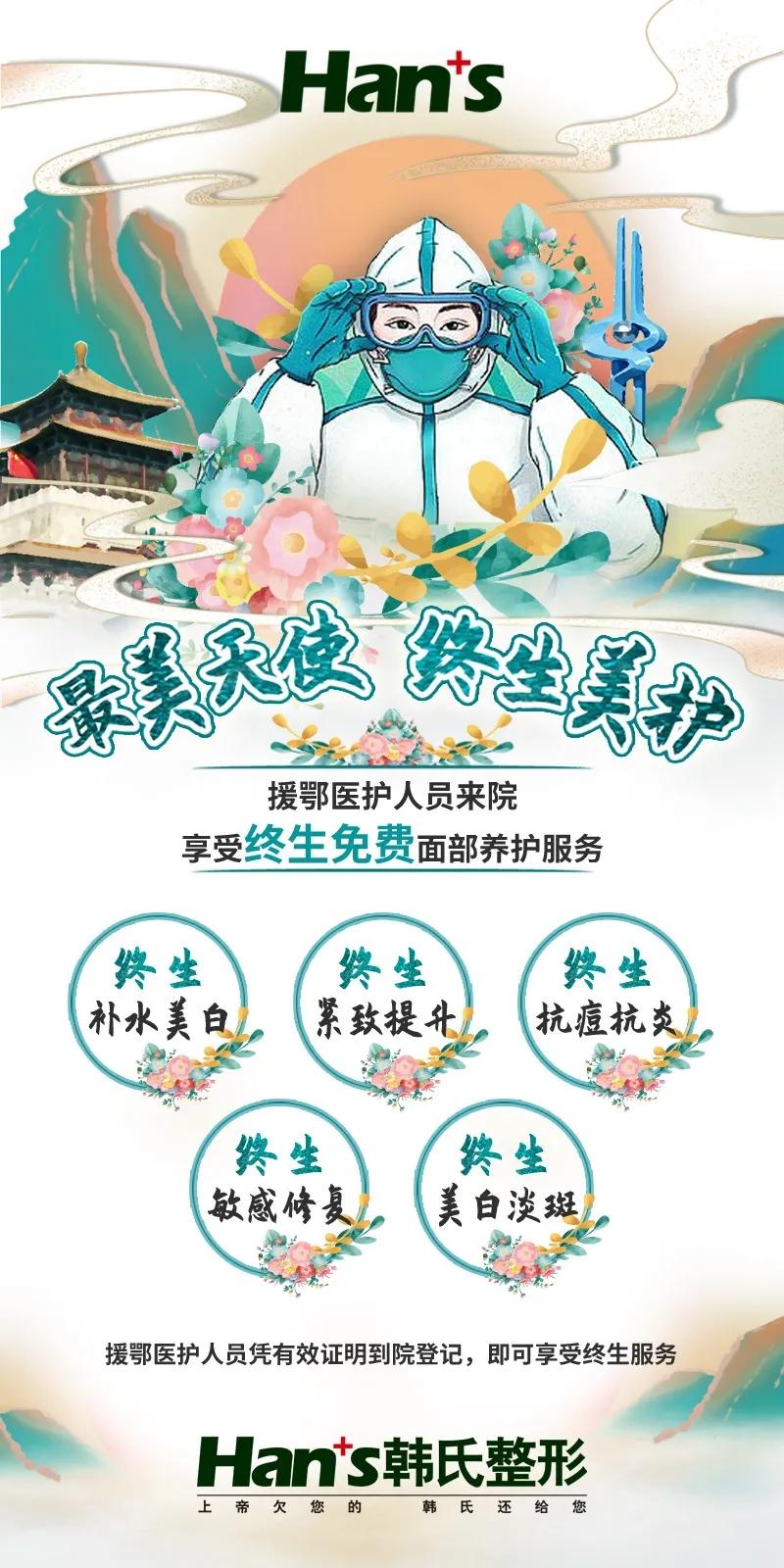 凡援湖北医护人员来院,可享受终生免费面部养护服务。