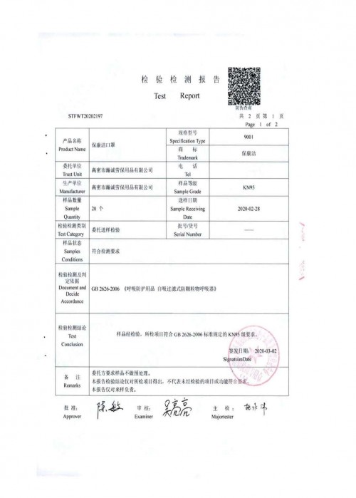 而保康洁KN95口罩遵循中国标准GB2626-2006呼吸防护用品自吸过滤式防颗粒物呼吸器标准制作,获得欧盟CE认证,对于非油性颗粒物的过滤效率高达95%,其中KN95/N95口罩中有“用”标志的口罩能用于医护人员抗疫期间的一线防护,没有“用”标志的口罩不建议护医护人员使用,普通人可以用符合GB19083的1级以上的口罩,既能达到95%的过滤性,也能防止液体的渗透,可以用于医疗机构各类操作,能将有害气溶胶,包括粉尘、熏烟、雾滴、毒气和毒蒸气等经滤料吸附,阻挡而不被人所吸入,保障国人的生命不受病毒威胁。