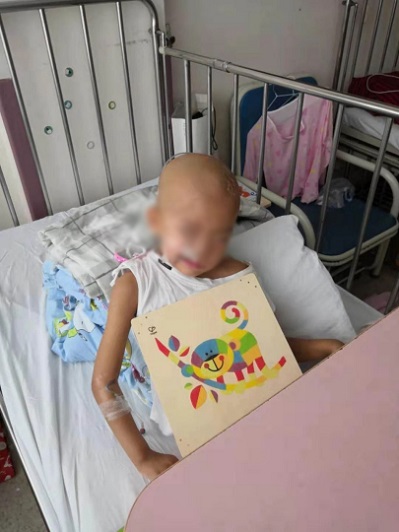 小蕊蕊在治疗的一个半月里,体重就跌了5 斤,原本可爱的脸蛋没了光彩,慢慢的蕊蕊变成了一个小光头,大大的眼睛也因为肿瘤压迫无法睁开。