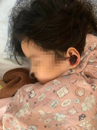 一直拖到2019年5月16日,蕊蕊在午睡后突然脸明显肿起来,耳道出血并且左耳朵后面能摸出突起小包,妈妈赶紧带蕊蕊去急诊再一次看了五官科和儿科。