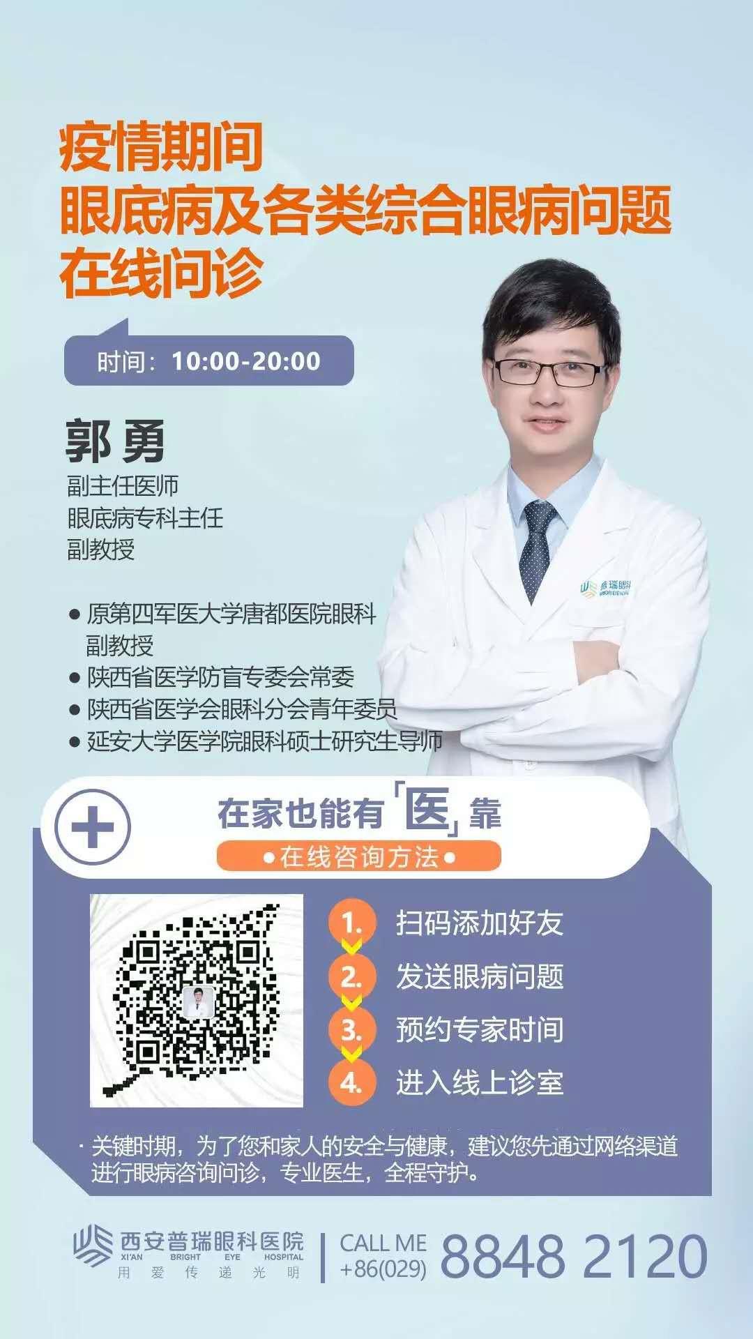疫情期间,为更好地保障广大眼病患者的生命安全及就诊需求,西安普瑞眼科医院特开设“眼科医生 线上问诊”服务,为大家的眼部健康保驾护航!如果您有问题,可线上咨询。