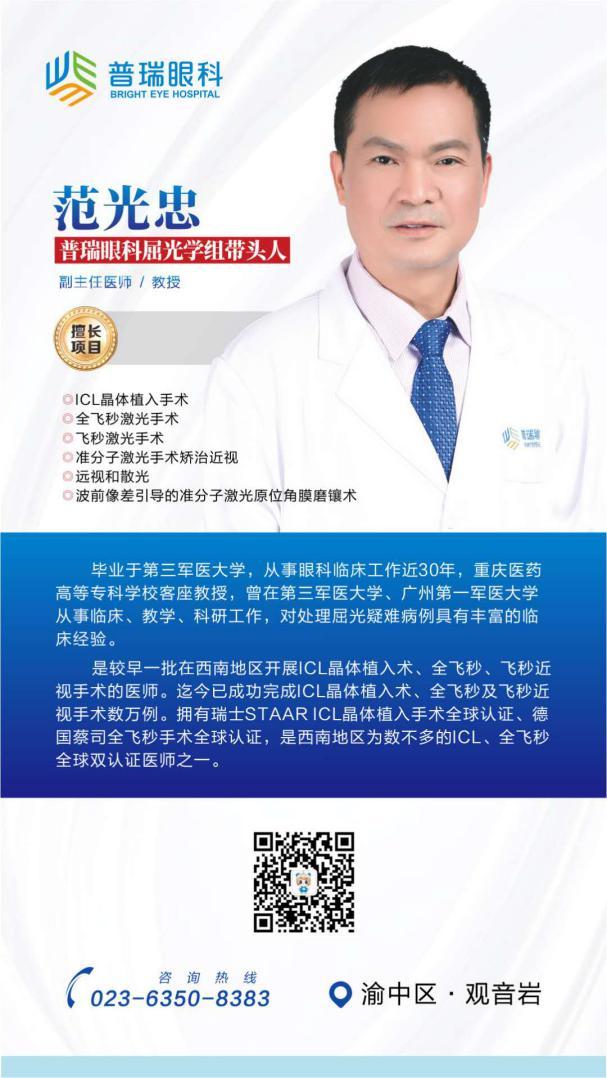 范光忠教授从事眼科临床工作20余年,曾在第三军医大学、广州第一军医大学从事临床、教学、科研工作,对处理屈光疑难病例具有丰富的临床经验,首批在西南地区开展全飞秒、飞秒激光手术,迄今已成功完成全飞秒、飞秒激光及准分子激光手术万余例。重庆普瑞眼科医院的检查仪器、手术设备采用以精工技术闻名全球的德国蔡司全系设备,并创新眼科行业“1+1”贴心服务,支持全国16城普瑞眼科连锁医院免费复查,拥有被奉为行业金标准的“66项安全体系”,更好地为近视患者提供技术和服务保障。
