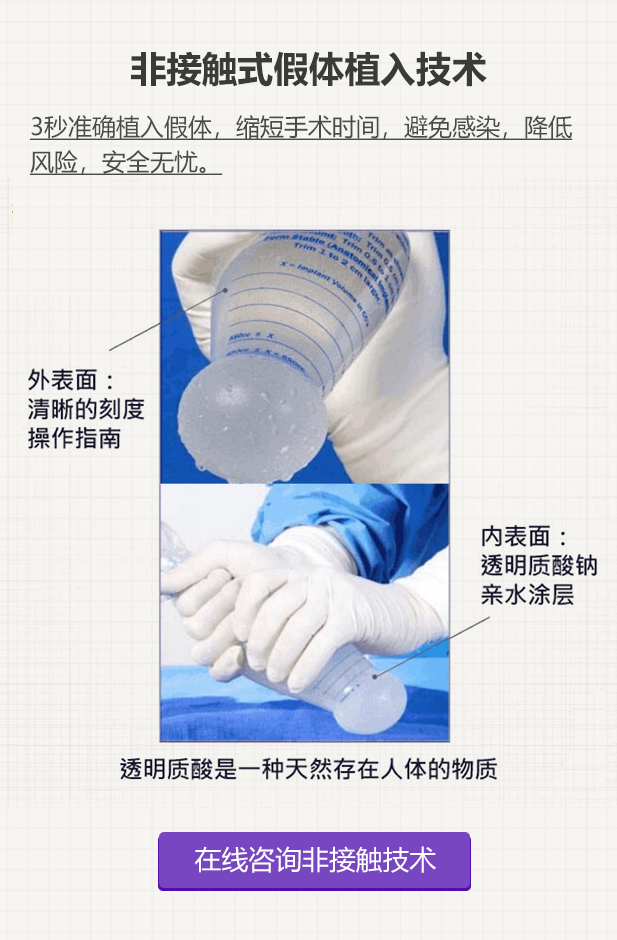 个性化设计,精细至1cm-3cm的隐蔽切口;专家手法轻柔快捷,假体植入时间缩短50%;创伤更小,术后基本无疼痛感,恢复期短;触感真实柔软。
