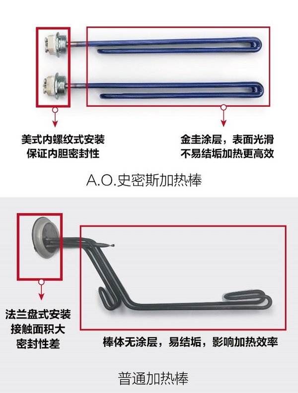 市面上大多数热水器加热棒都是无涂层保护的,这就无法有效解决结垢问题,A.O.史密斯是将内胆上不易结垢的金圭材料用到了加热棒上,不易结垢也就意味着加热棒更长久高效。