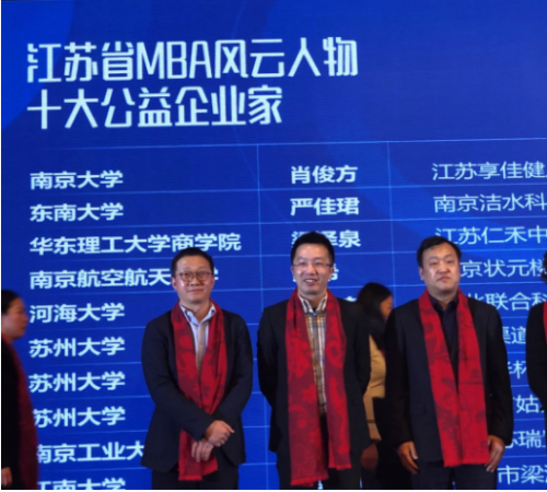 近日,由江苏省MBA企业家联谊会、江苏省MBA联合会主办的“创青春·赢未来第十届江苏省MBA发展论坛暨江苏省MBA企业家联谊会成立十周年庆典”在南京举行。江苏省工商联合会副主席丁荣余、江苏省MBA联合会创会主席党建兵、南京大学商学院院长沈坤荣、阿里巴巴集团合伙人方永新及江苏省MBA企业家代表等出席活动。享佳健康董事长肖俊方应邀出席,并获得“十大公益企业家”的称号,这标志着肖董在公益事业上的努力获得了社会的认可。