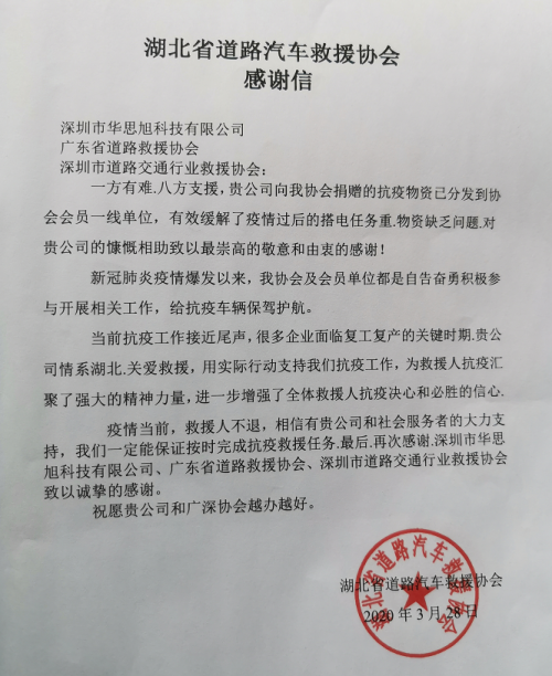 来自湖北道路汽车救援协会的感谢信