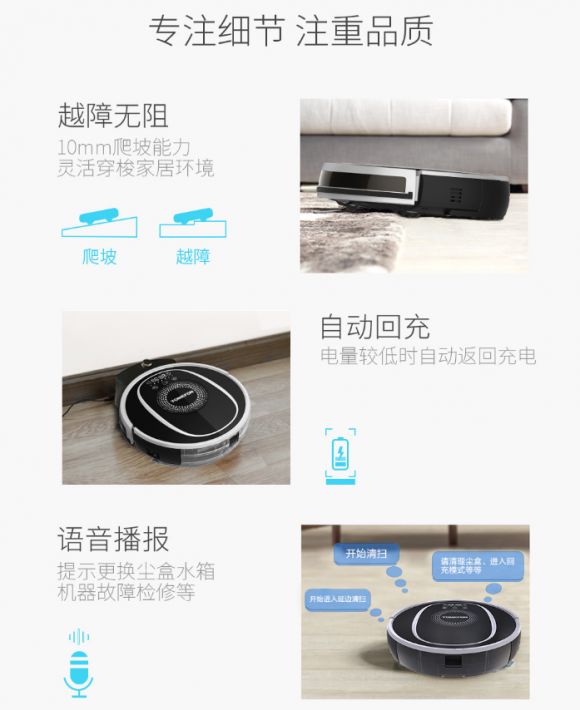 具有爬坡、越障等脱困能力的斐纳TOMEFON-TF-MCN858扫地机器人,可以灵活在家居环境里自由穿梭;在底部还同时装有14组红外探测装置的智能防跌功能,可以让机器人能及时转向;在机器人电量不足的情况下还能自动返回进行充电,随时保证扫地机器人都是有电待机模式,想用便能用到。