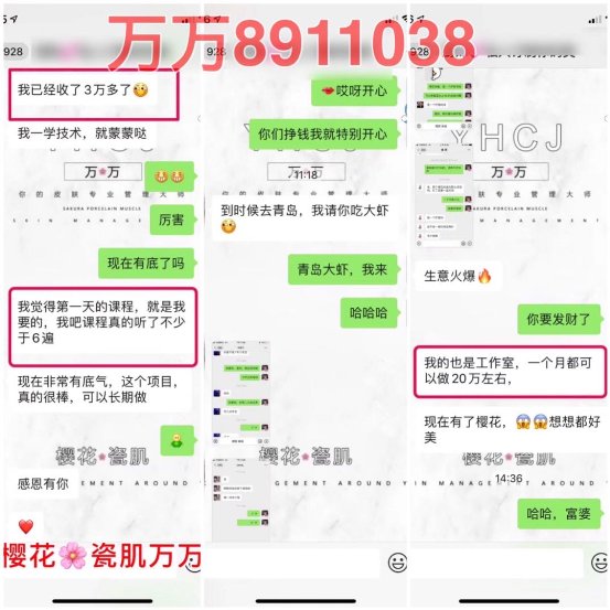介绍下她的基本情况,有个工作室,一个月的业绩在20W左右。当然谁都想让自己更上一个台阶,她听朋友说樱花瓷肌培植不错,就在微博上找到了@樱花瓷肌创始人万万。问了很多、很细,也对比了很多,最终选择了加入我们团队,我还记得最担心的问题是:“一学技术就蒙蒙哒”
