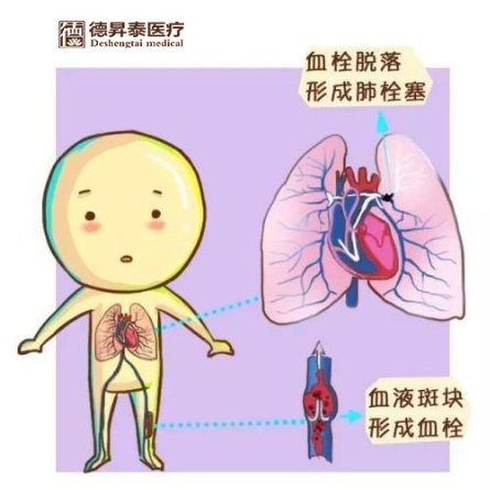 当静脉曲张病情进展,伴发浅静脉内血栓形成时,则可向上通过大隐静脉根部蔓延至股静脉,或者通过交通支蔓延至其他深静脉,进而导致血栓脱落,形成肺栓塞。